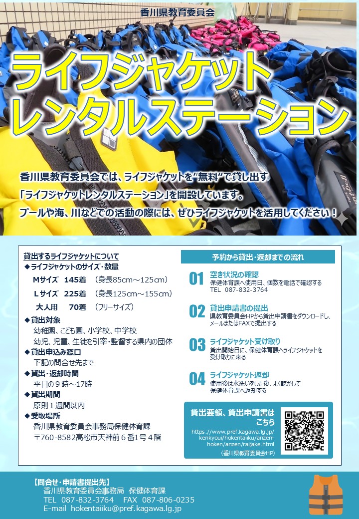 各学校(園)及び幼児・児童・生徒を引率・監督する団体の皆さま、プールや海、川などでの活動の際には、ぜひライフジャケットを活用してください。