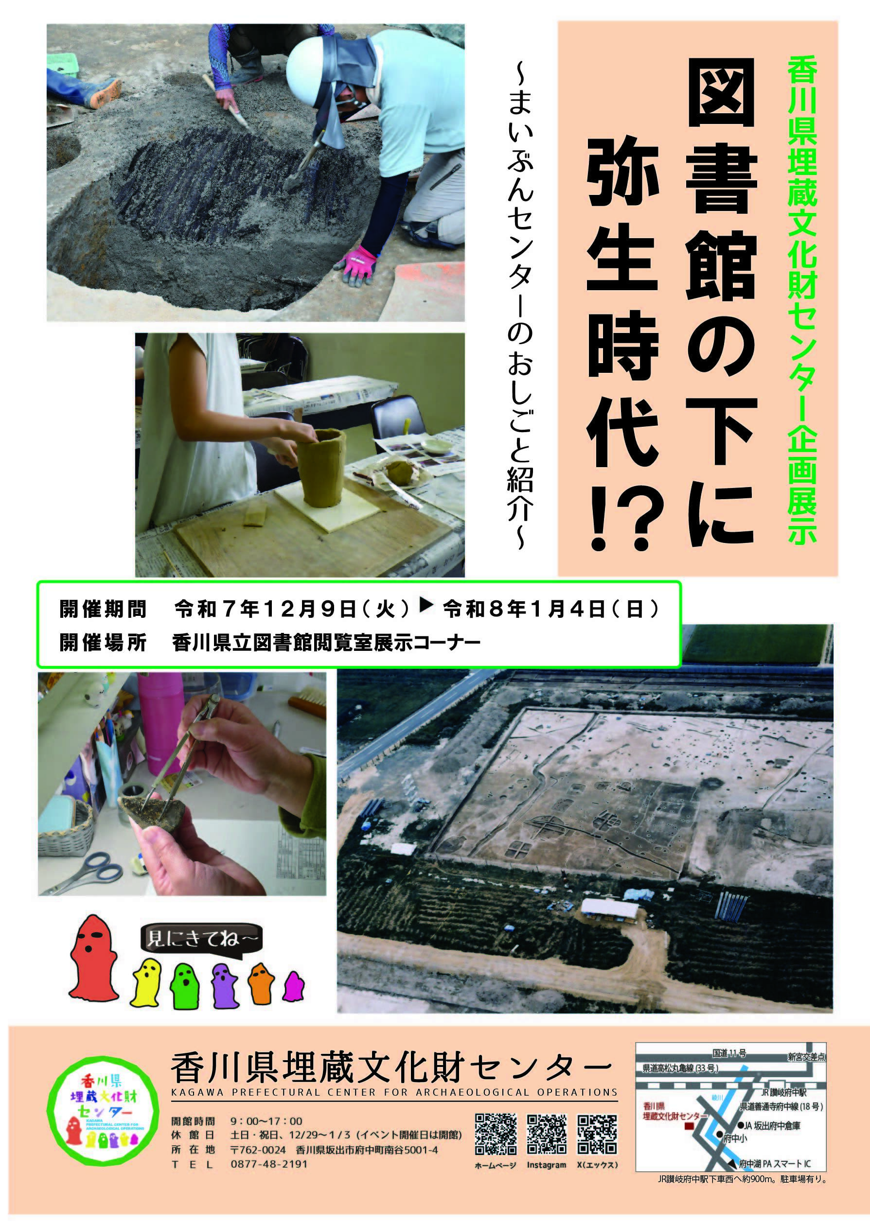 | 本展示では、みなさんが利用している県立図書館を建てる際に、埋文センターが実際に発掘調査を行った「空港跡地遺跡」をとりあげながら、埋文センターの仕事について紹介します。 | ![]() |