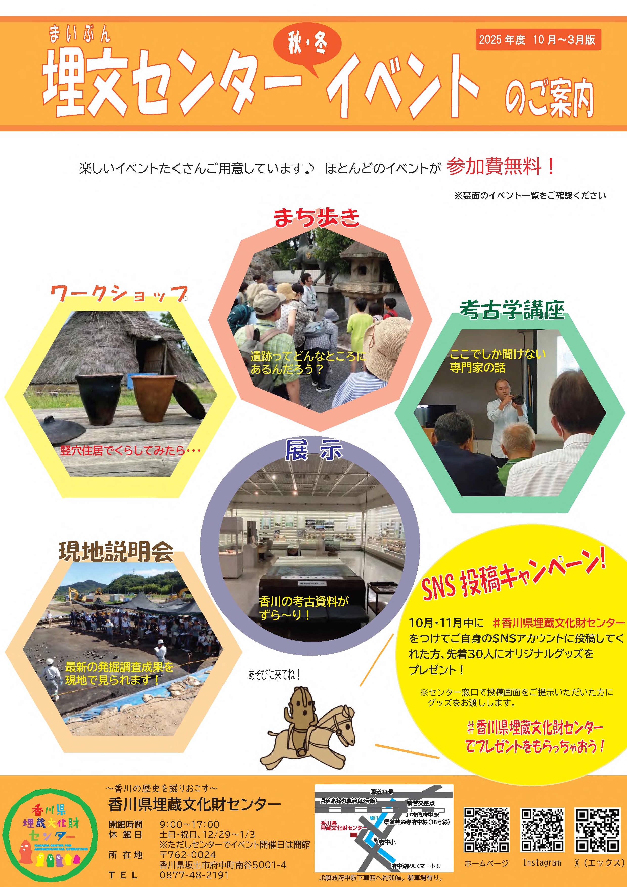香川県埋蔵文化財センターで、下半期に開催予定のイベントを一覧にして御案内します。当センターのホームページやインスタグラム、フェイスブックなどでもイベント情報を公開しています。