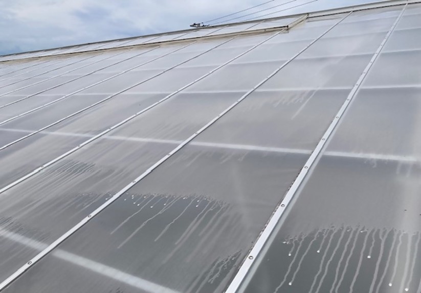 遮熱剤「Qヒート」(熱線を反射する遮光剤、NIR(近赤外線)を選択的に反射し、光合成に有効な光(PAR)は比較的多く透過するため、多くの日射を必要とし、温室内の温度を抑えたい場合に最適なもの)