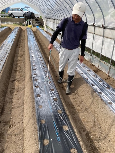 3.遮光剤を水で10倍に希釈し、背負噴霧器等でマルチ天部分に散布する。着色が薄い所は3度掛けする。50~80m畝で約10リットル使用する。