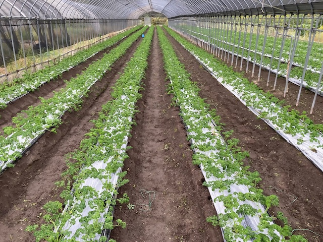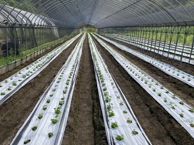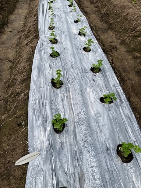 1.畝立後に灌水チューブを敷き、その上に穴開き黒マルチを敷設する。マルチの肩から下部分は折り返して天部分のみ被覆する。